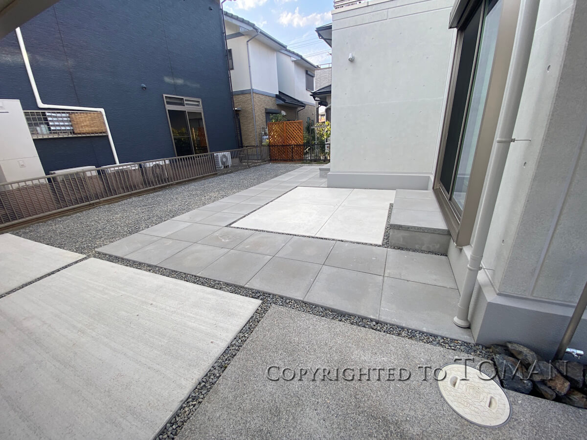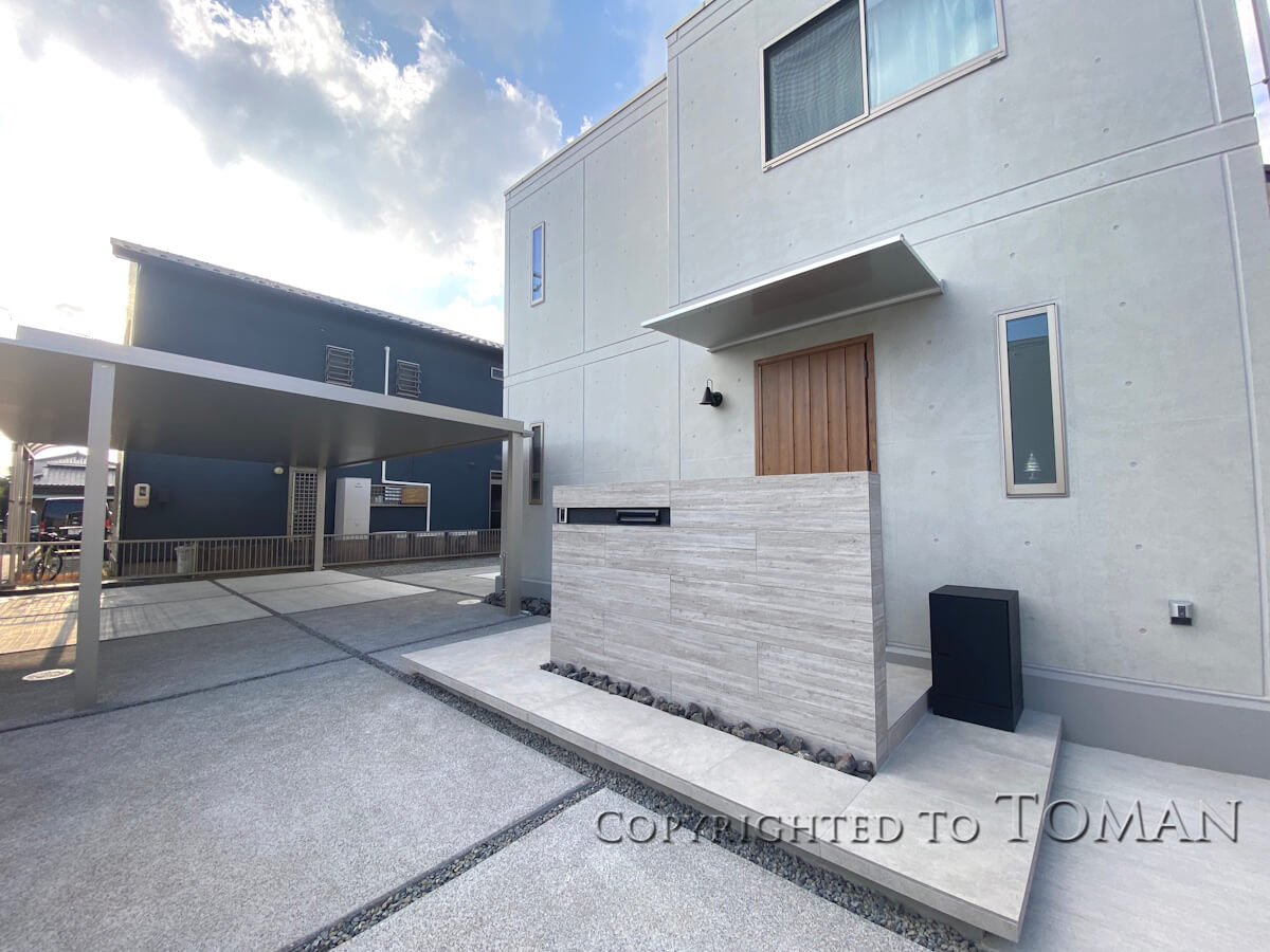 コンクリート造の住宅外壁に合わせて、外構全体もコンクリートグレー・ライトグレーのワントーンでまとめたシンプルデザイン。