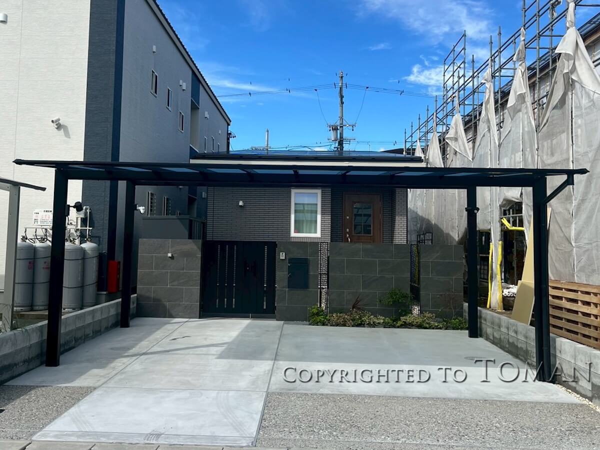 駐車場にはスタイリッシュなデザインの三協アルミ・スカイリードを設置しました。