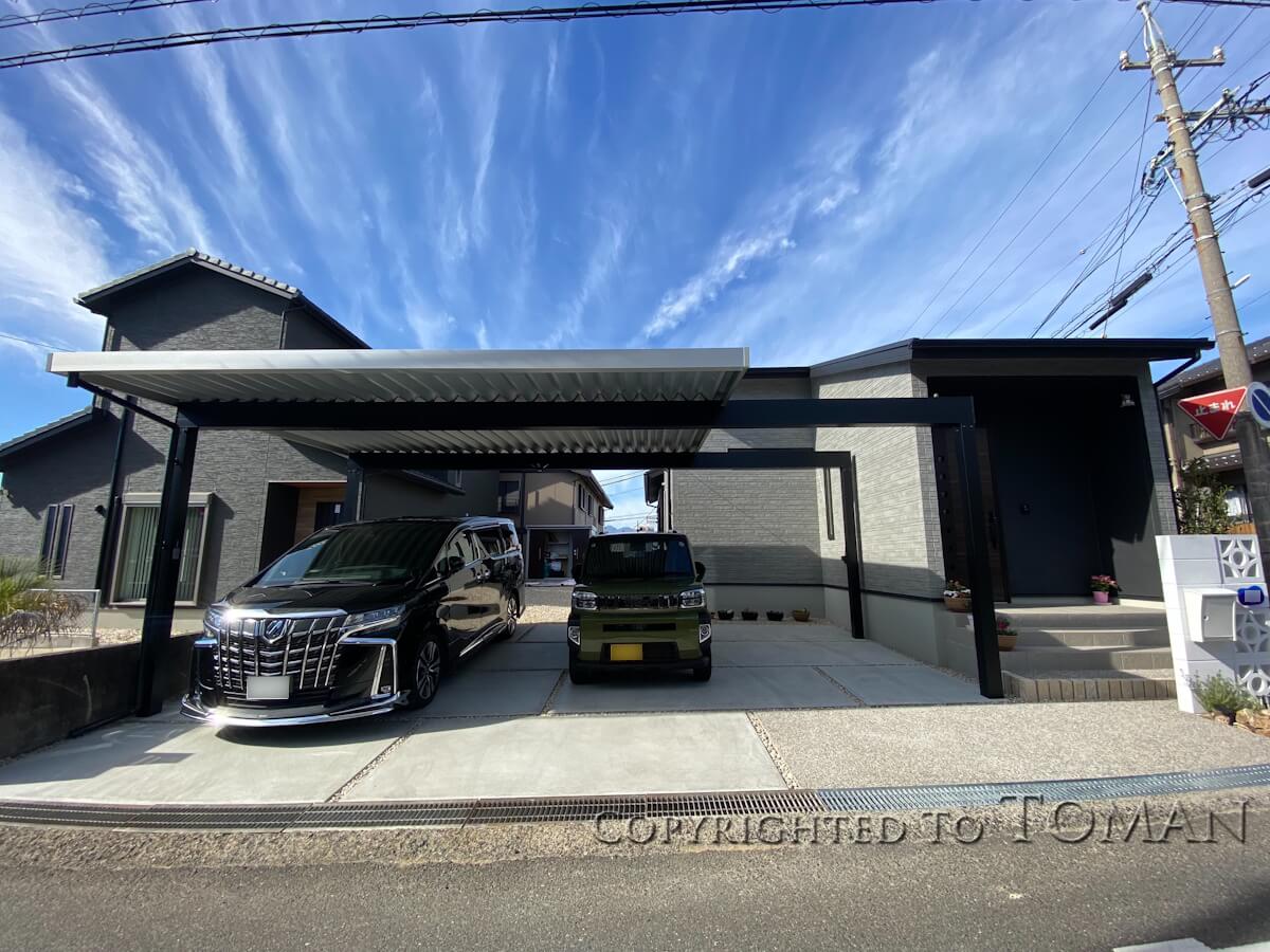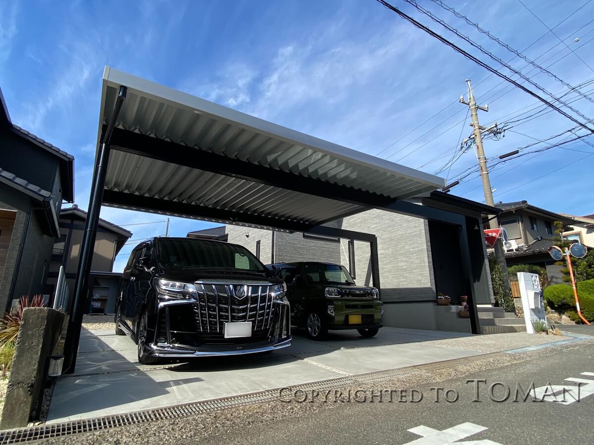 駐車場には三協アルミ社の折板カーポート・G1-Rを施工。屋根と柱の色を変えたツートン仕様で、さらに梁延長にすることで存在感を放っています。