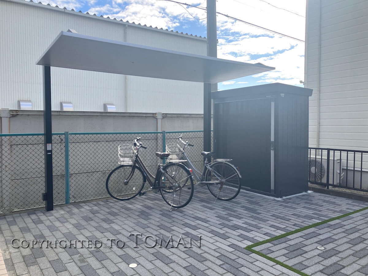 石調の大判サイズタイルで仕上げた門袖壁と浮き階段、縦格子のスクリーンフェンスで高級感のあるモダンな門まわりにリニューアルしました。門の内側のエントランススペースは、細長いサイズのインターロッキングブロックを2色使い、色のバランスと、ブロックの向きに変化をつけることでこだわりの舗装に。自転車置き場としてSCミニを設置しました。